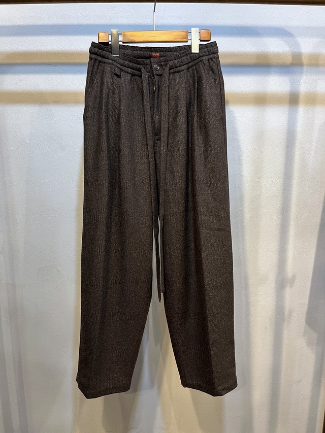 ドレッシーな雰囲気がありながらも穿き心地が快適なトラウザーズです。 2タックのフォーマルな表情に、ウエストのゴムシャーリングと同素材のドローコードを組み合わせ、 “きちんと感”と“リラックス”を絶妙なバランスに 裏地にはコットン素材を採用。 肌に触れたときの冷たさやウール特有のチクチク感を抑えてます^ ^ 見た目は上品にですが穿き心地はリラックスのオススメの1本ですよ☆