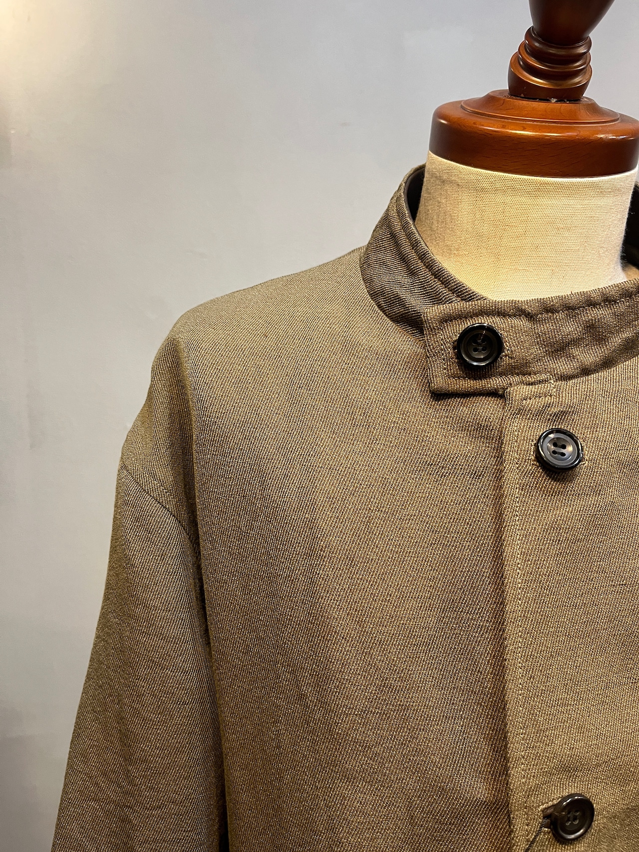 縦糸にスーパ-140’sの上質な梳毛、緯糸にヘンプ麻を打ち込み、製品洗いをかけることで、まるでポール・ハーデンを思わせるような枯れた風合いと立体感を表現しています。